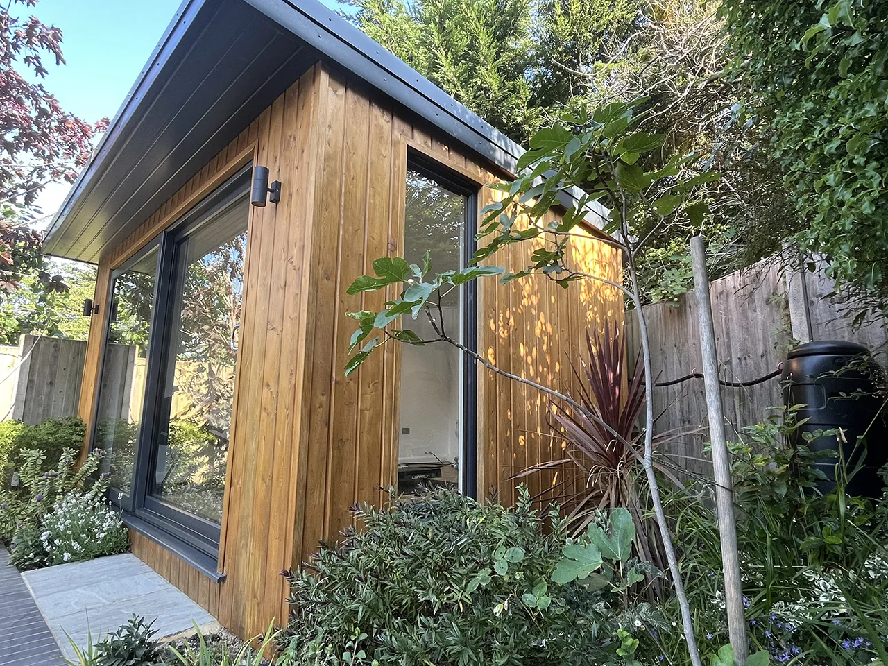 The build is clad in larch on the front, left and side walls with the back wall clad in white UPVC, which is non-visible from the garden. As well as an anthracite grey UPVC 3m sliding door, our busy clients also chose an anthracite grey full-length window on the right hand wall allowing the room to flood with natural light as well as providing a view of the garden whilst working out.