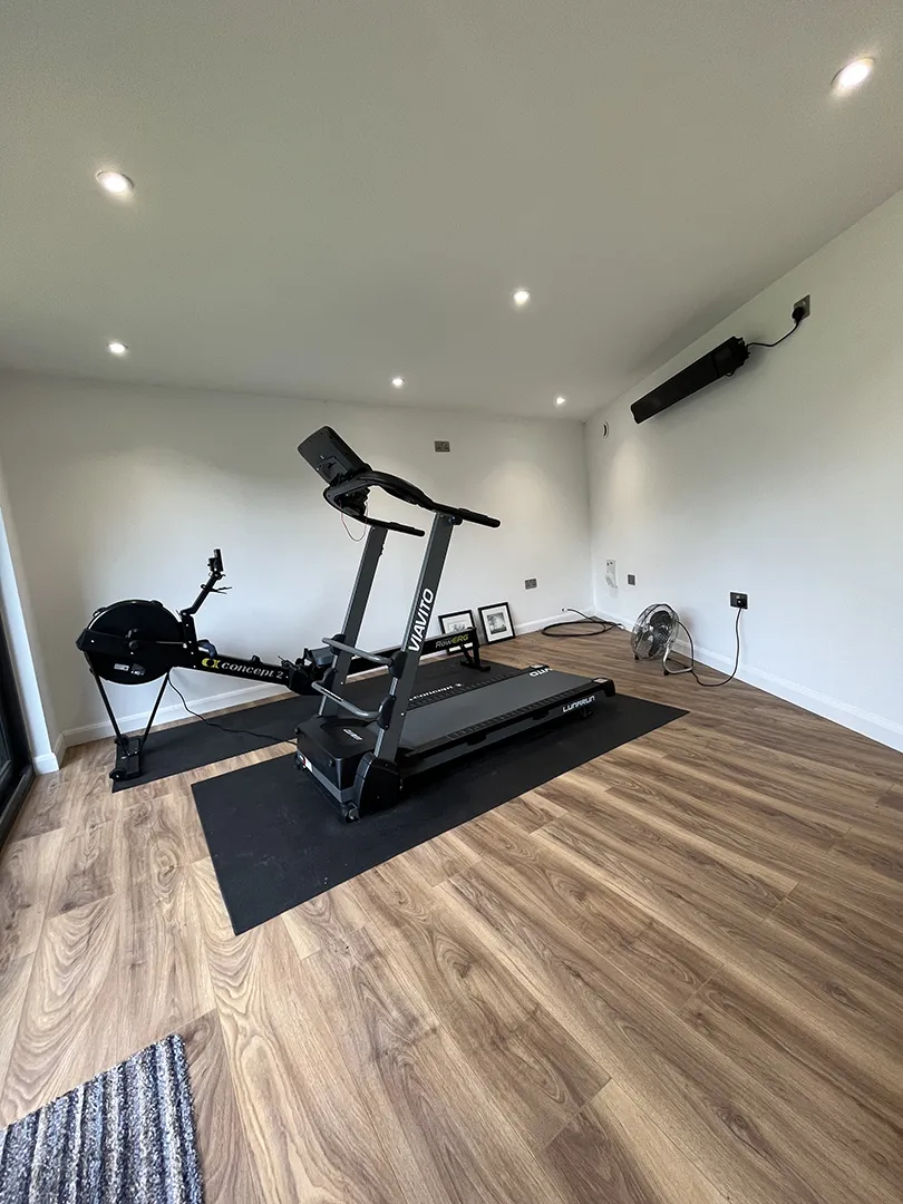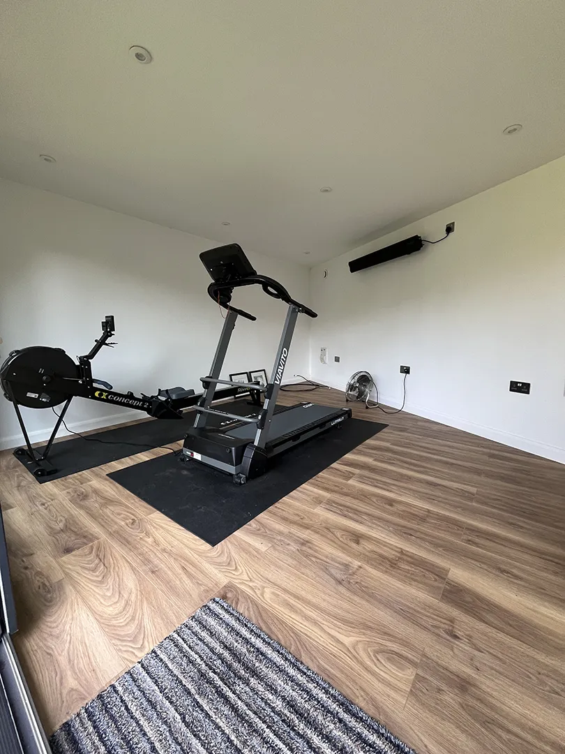 As with all our builds, unless otherwise requested, the garden gym comes with an EPDM roof, guttering, anthracite grey Soffit and Facia, fully certified electrics within the building, 3 double sockets and 4 interior downlights. It was professionally plastered and finished with a base coat whitewashed walls and a laminate floor and skirting laid.