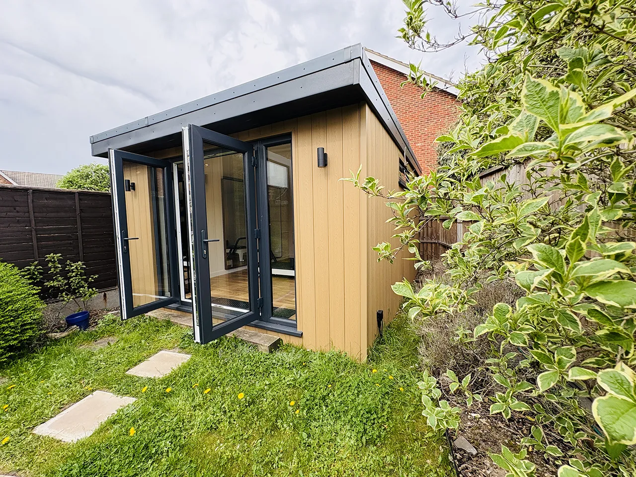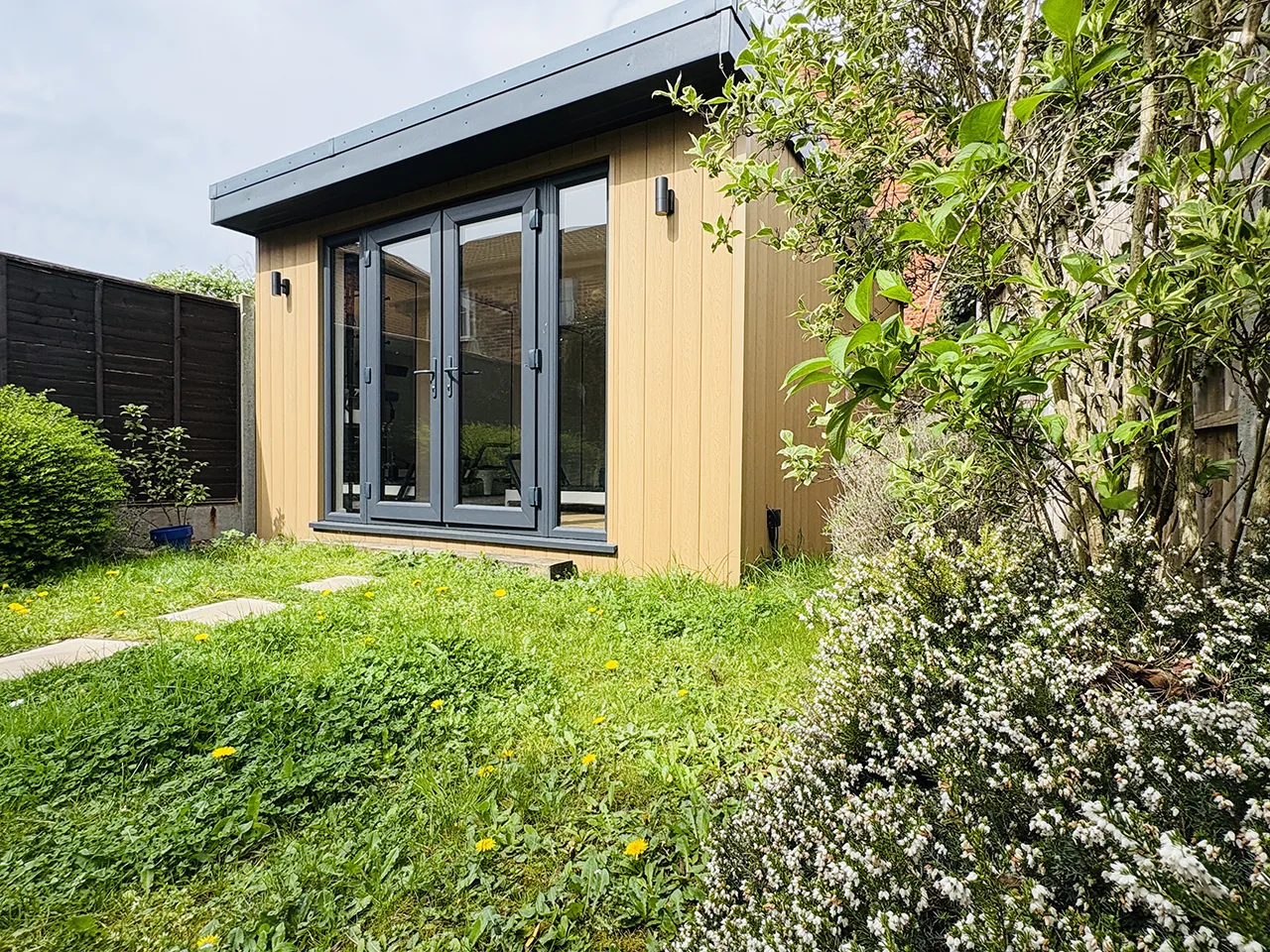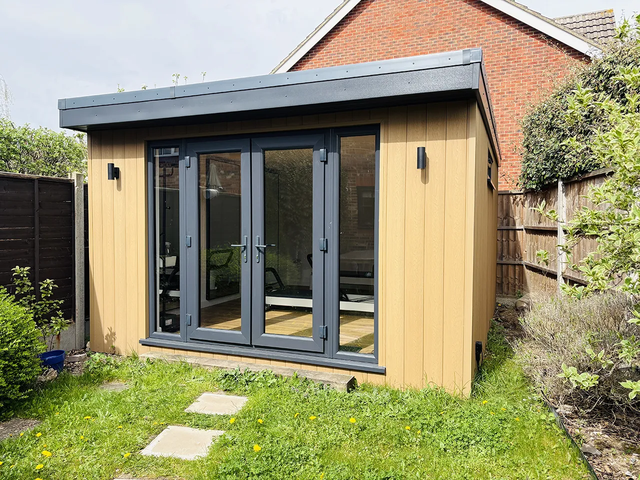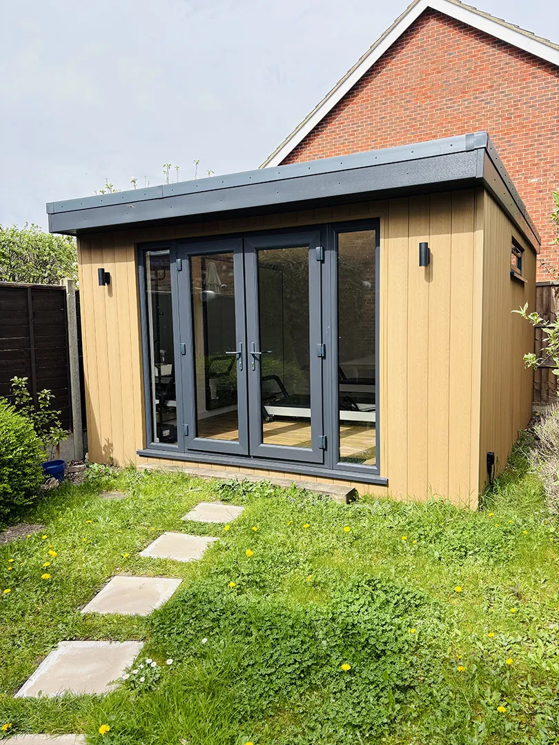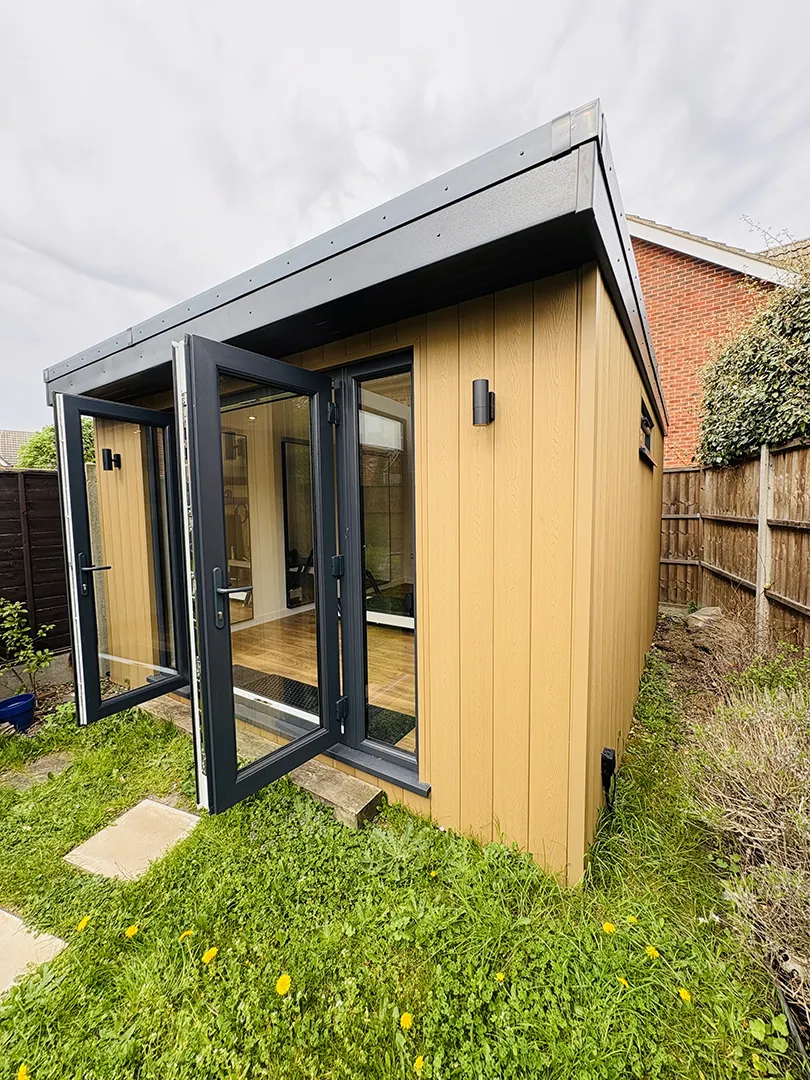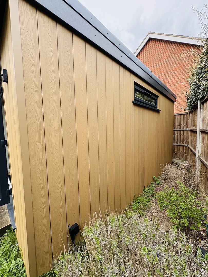 The 2.3m French doors let in plenty of light and our client chose to add an openable security window on the right-side wall. The visible front and right walls are clad in Dura Alaskan Cedar to create a more natural feel whilst the non-visible back and left walls are clad in white UPVC.
