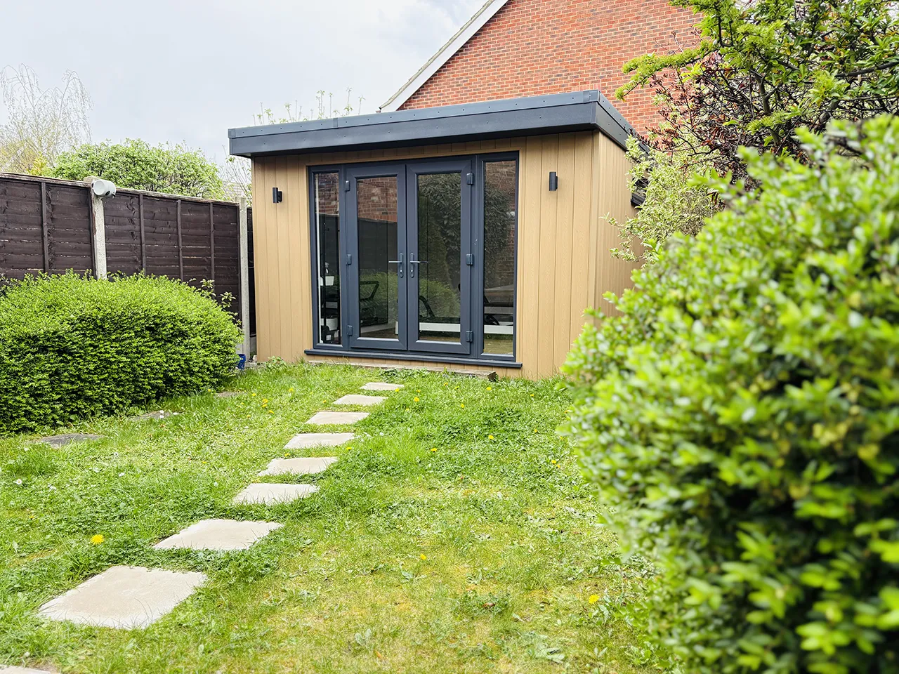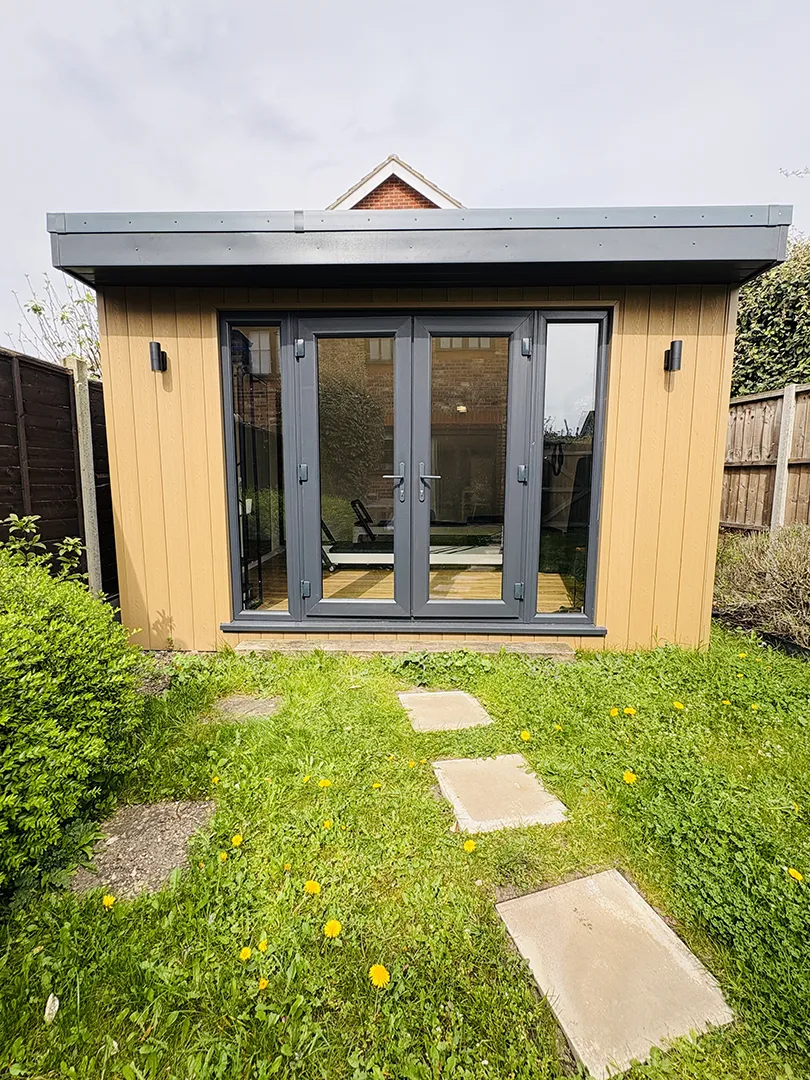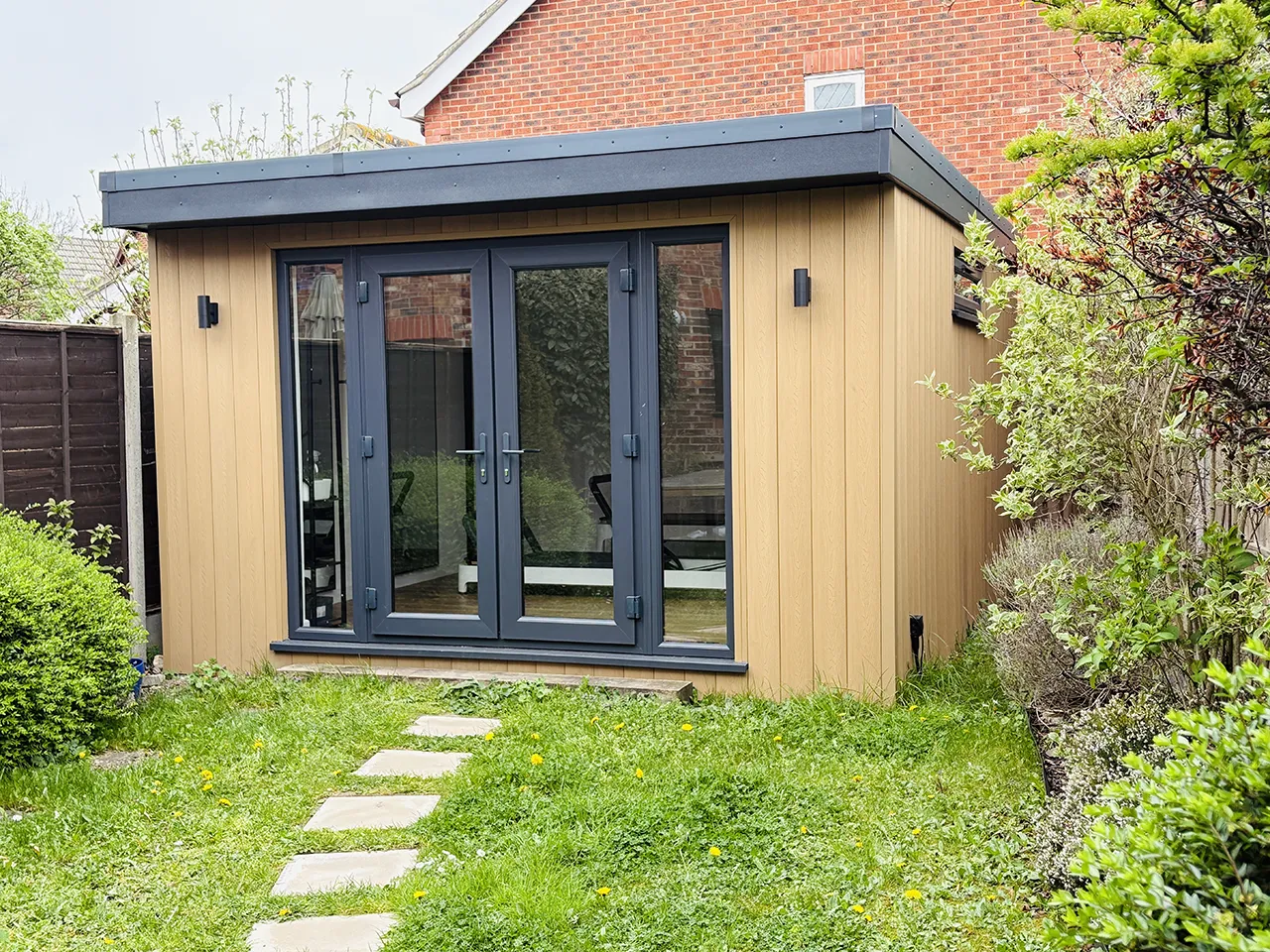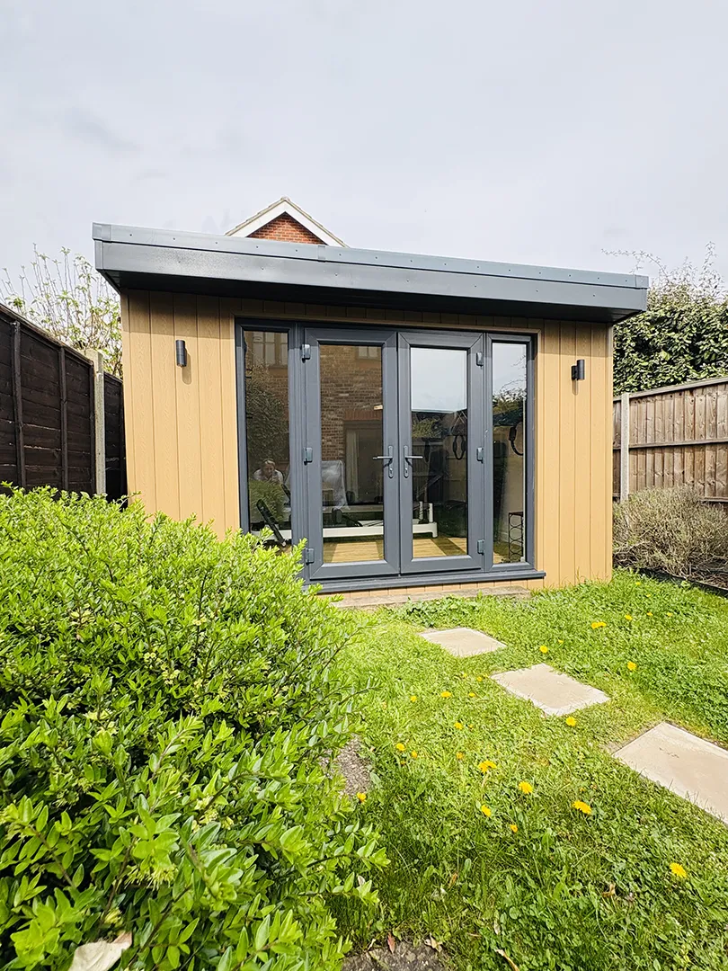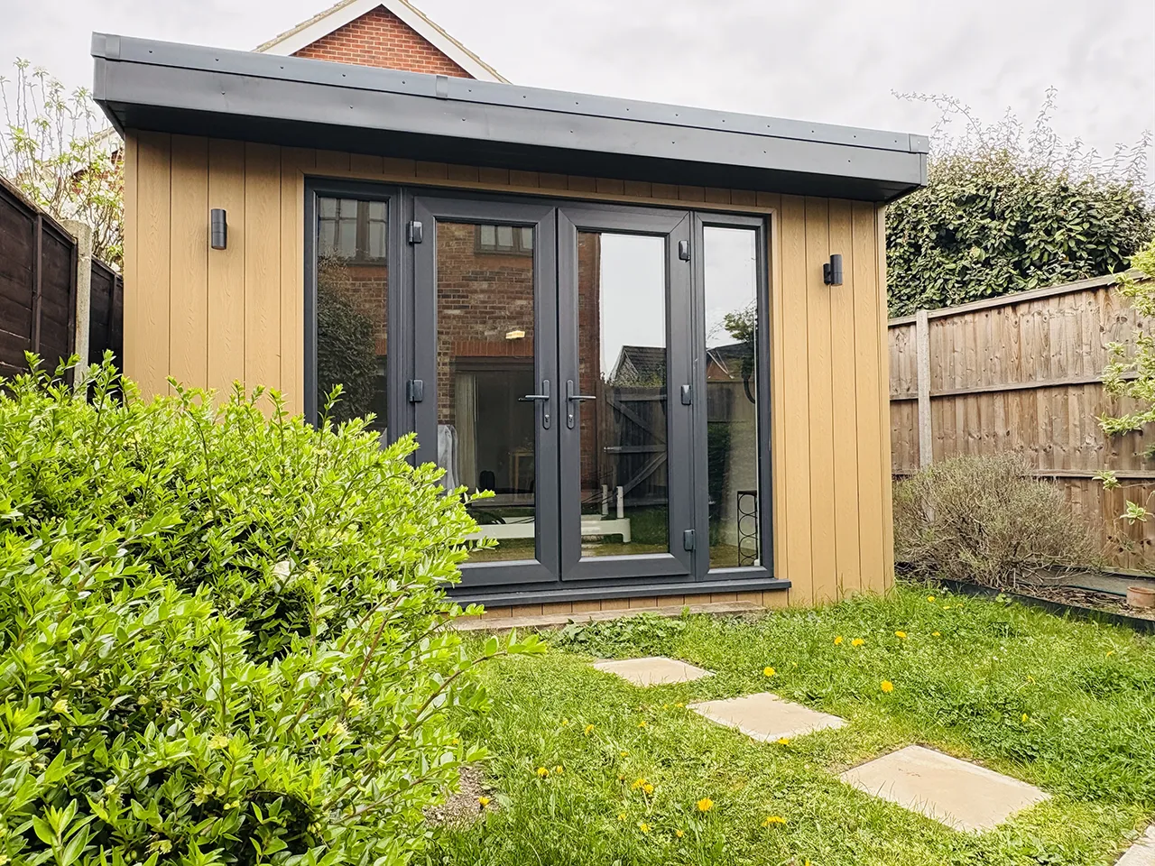 The 2.3m French doors let in plenty of light and our client chose to add an openable security window on the right-side wall. The visible front and right walls are clad in Dura Alaskan Cedar to create a more natural feel whilst the non-visible back and left walls are clad in white UPVC.